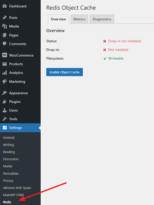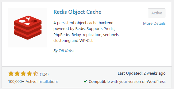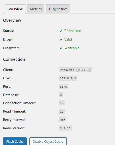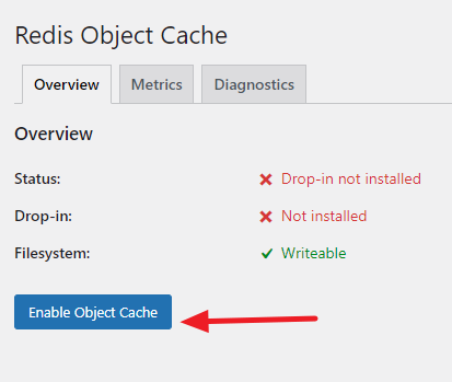 Next, install and Activate the Redis Object Cache plugin via the WordPress Dashboard.