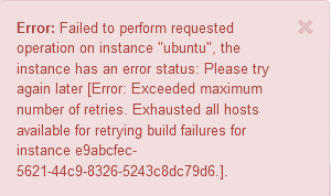 Error: Failed to perform requested operation on instance "ubuntu", the instance has an error status: Please try again later [Error: Exceeded maximum number of retries. Exhausted all hosts available for retrying build failures for instance e9abcfec-5621-44c9-8326-5243c8dc79d6.].